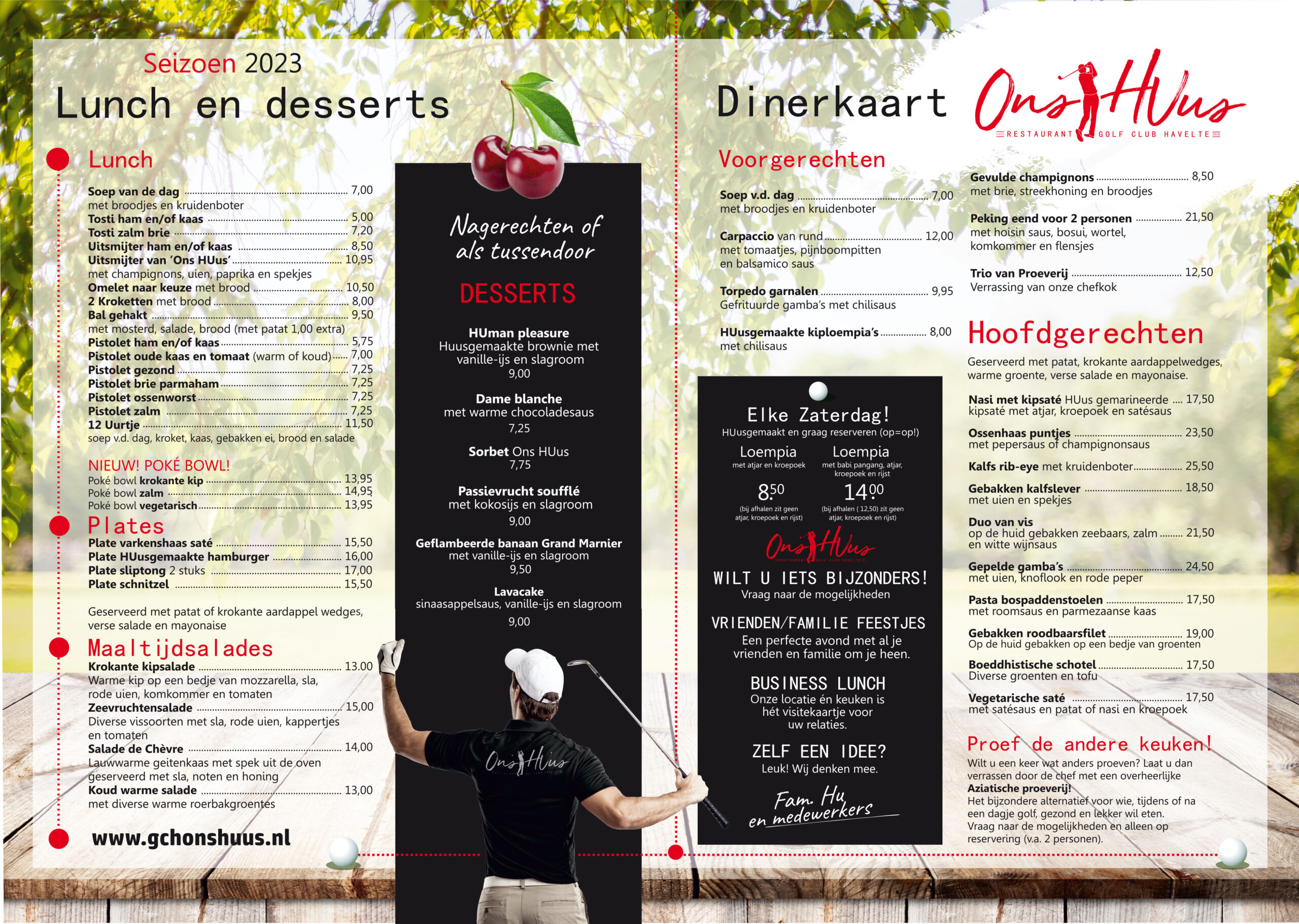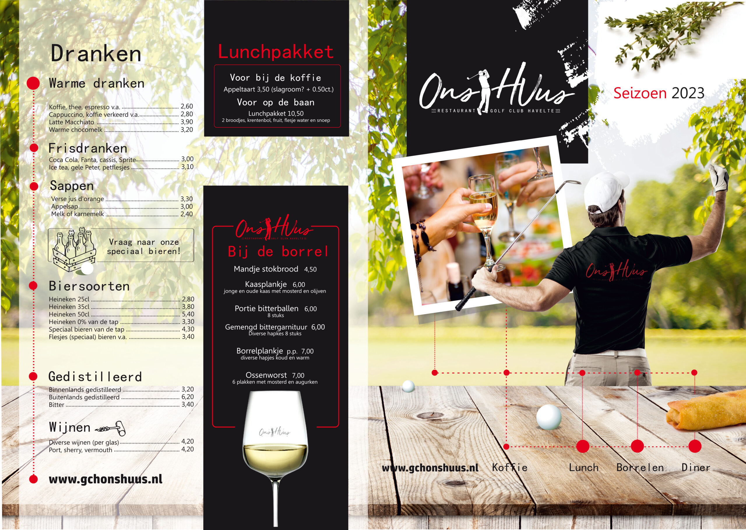 Wilt u voor uw ronde alvast genieten van wat u in de baan te wachten staat ? Start dan met een verse koffie of lunch in het restaurant van Golf Club Havelte ’Ons Huus’ Vanuit het gezellige, sfeervolle clubhuis heeft u een prachtig uitzicht over de baan. Natuurlijk kunt u ook na uw ronde bij ons nagenieten van een drankje of een heerlijk glas wijn met een lekkere borrelgarnituur. En mocht u behoefte hebben om de inwendige mens te versterken, dan staat de chef-kok voor u klaar om iets heerlijks voor u te maken. Wij hanteren een uitgebreide lunch- en dinerkaart.